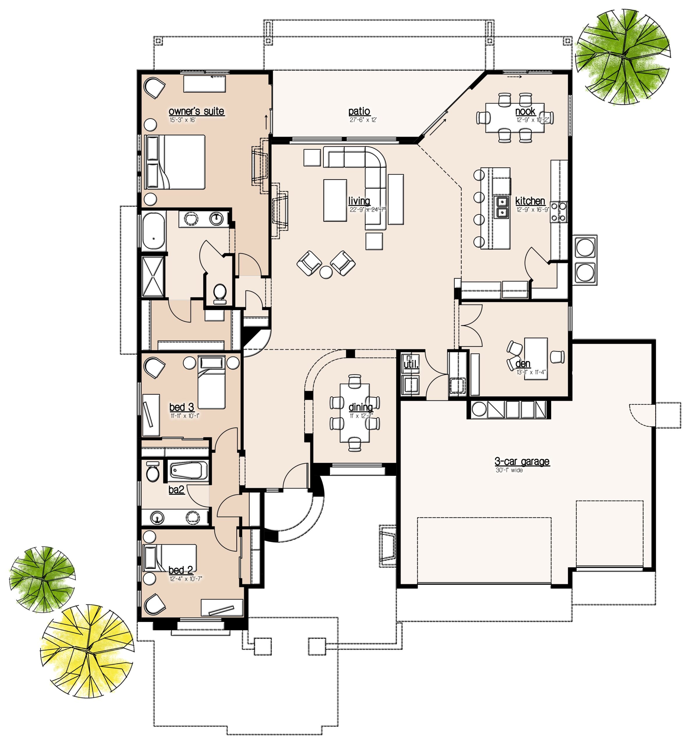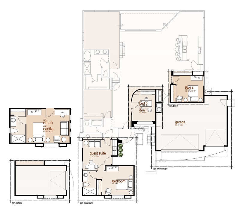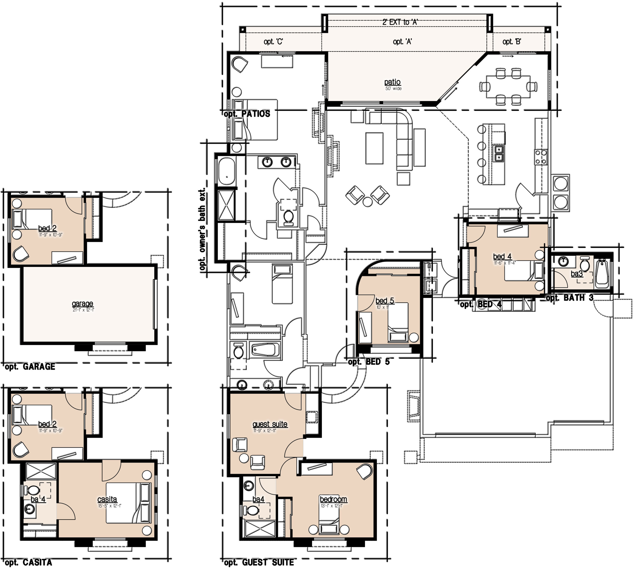 Single Family Home, Single Story, 3 Bedroom, Living Room, Dining Room, Kitchen, Den, Nook, 2 Bath, Three Car Garage, Optional Casita w/Full Bath, Optional 4th Bedroom ILO Den, Optional 5th Bedroom ILO Dining, Optional Luxury Master Bath, Optional 3rd Bathroom, Optional 4th Car Garage