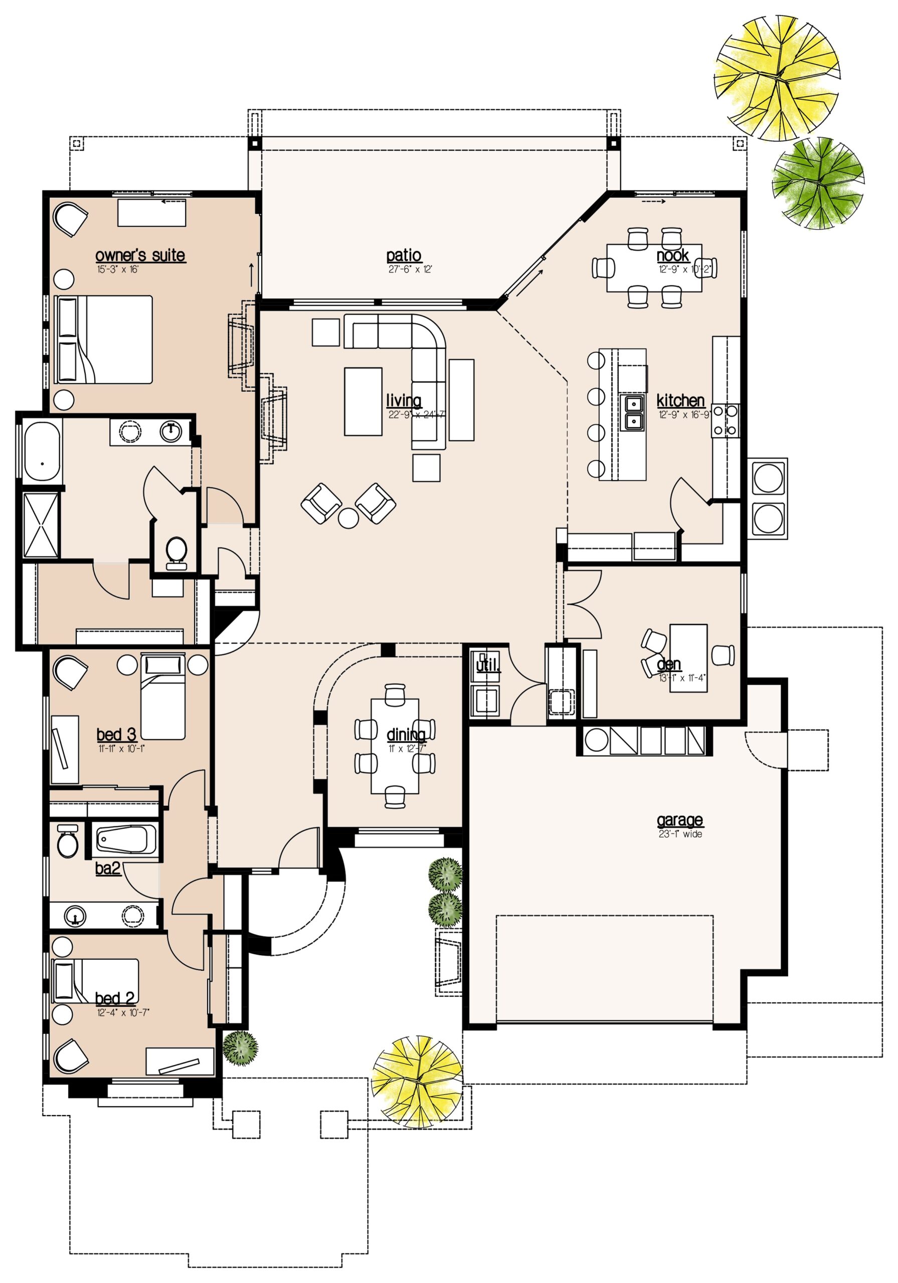 52’ wide | 66’ deep | 2474 sq. ft. | 3(4)(5) beds | 2 baths | 2(3) cars