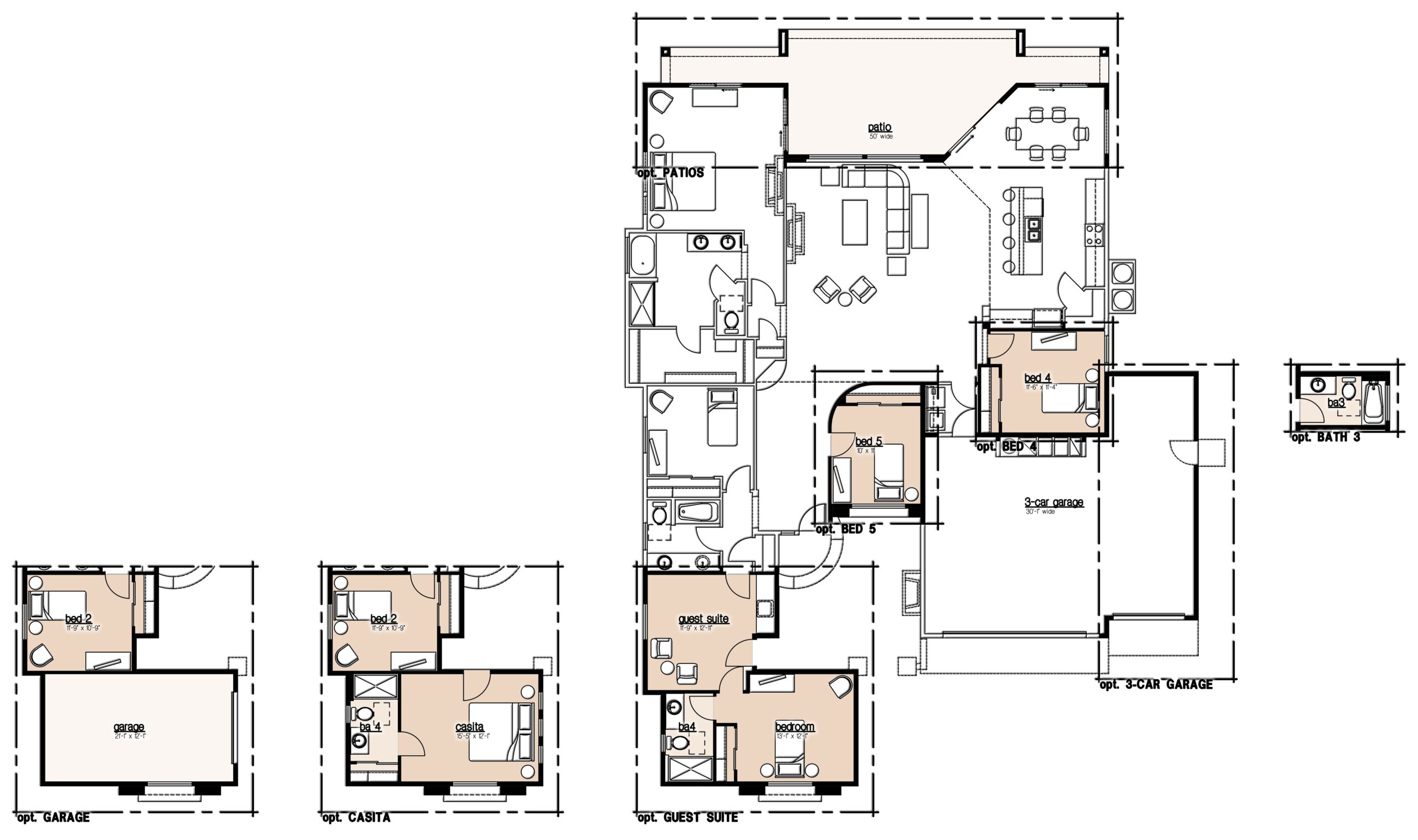 Single Family Home, Single Story, 3 Bedroom, Living Room, Dining Room, Kitchen, Den, 2 Bath, Two Car Garage, Optional Casita w/Half Bath , Optional 4th Bedroom ILO Den, Optional 5th Bedroom, Optional 3rd Car Garage, Lot Premium Not Included