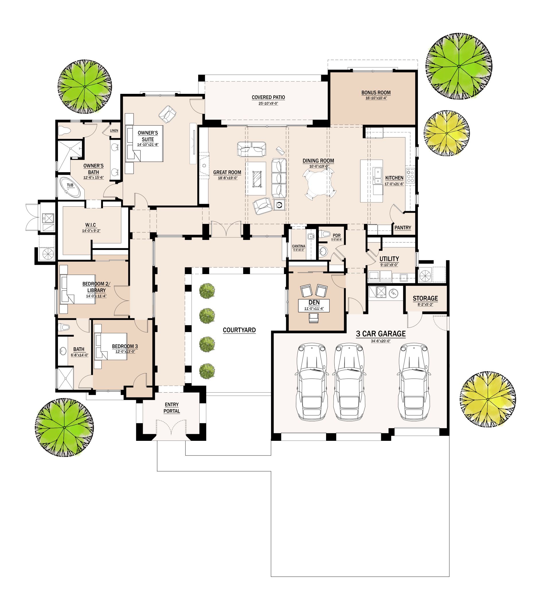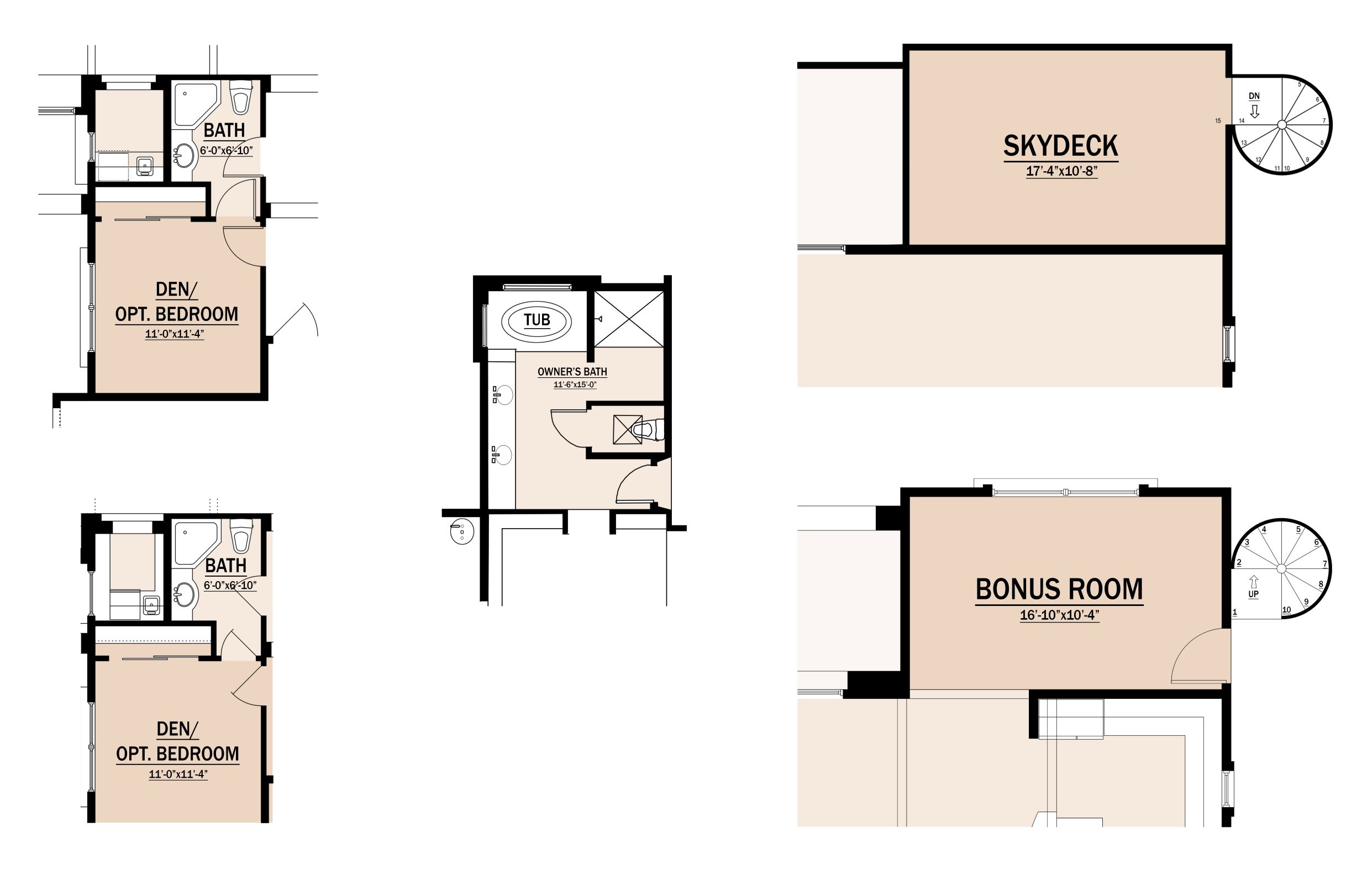 Single Family Home, 3 Bedroom, Dining Room, Kitchen, Great Room w/16’ Ceilings, Bonus Room, Den, 2 ½ Bath, Three Car Garage, Entry Portal to Interior Courtyard, Optional 4th Bedroom w/Full Bath, Optional Sky Deck